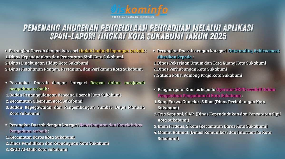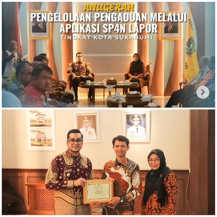 Sejumlah perangkat daerah mendapatkan penghargaan Wali Kota Sukabumi dalam Anugerah Pengelolaan Pengaduan melalui Aplikasi Sistem Pengelolaan Pengaduan Pelayanan Publik Nasional / Layanan Aspirasi dan Pengaduan Online Rakyat (SP4N Lapor), yang diadakan oleh Dinas Komunikasi dan Informatika (Diskominfo) Kota Sukabumi pada 4 Desember 2025 bertempat di Balai Kota Sukabumi.